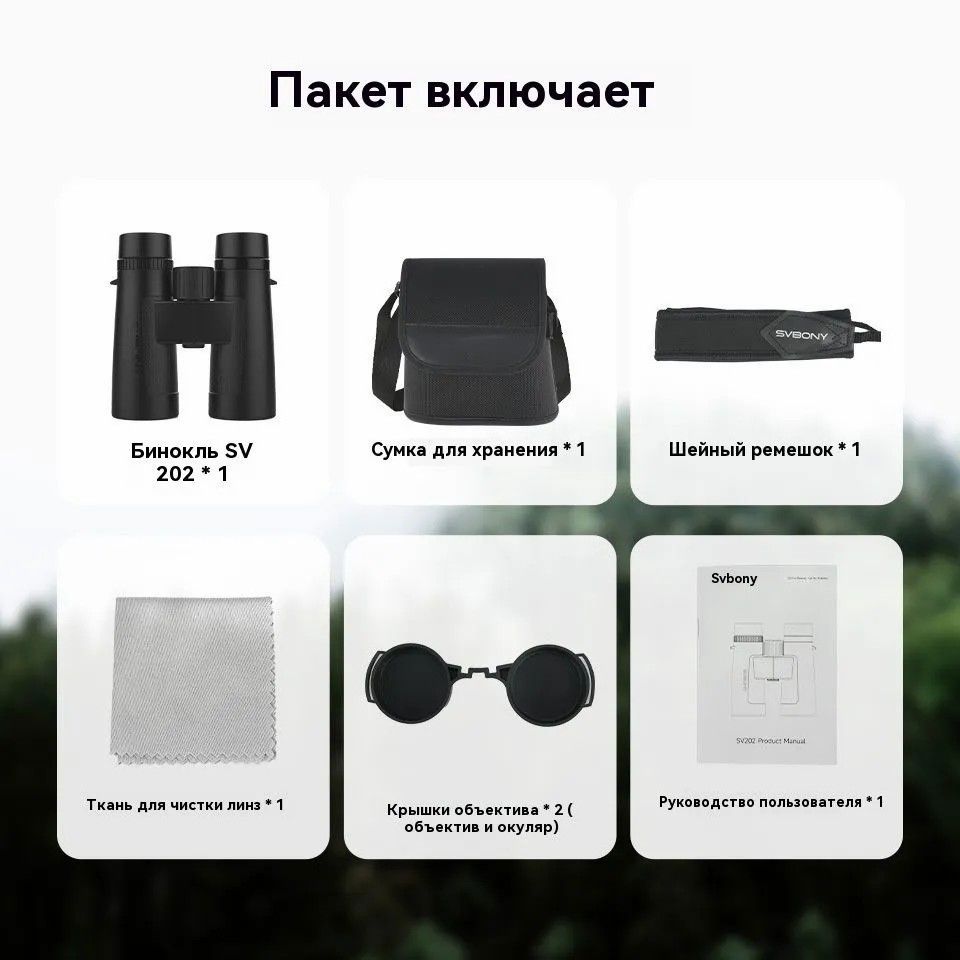 Бинокль SVBONY SV202 Pro 8x32, чехол для хранения и переноски, защита окуляров, защита объективов, салфетка для протирки оптики, ремень, инструкция.