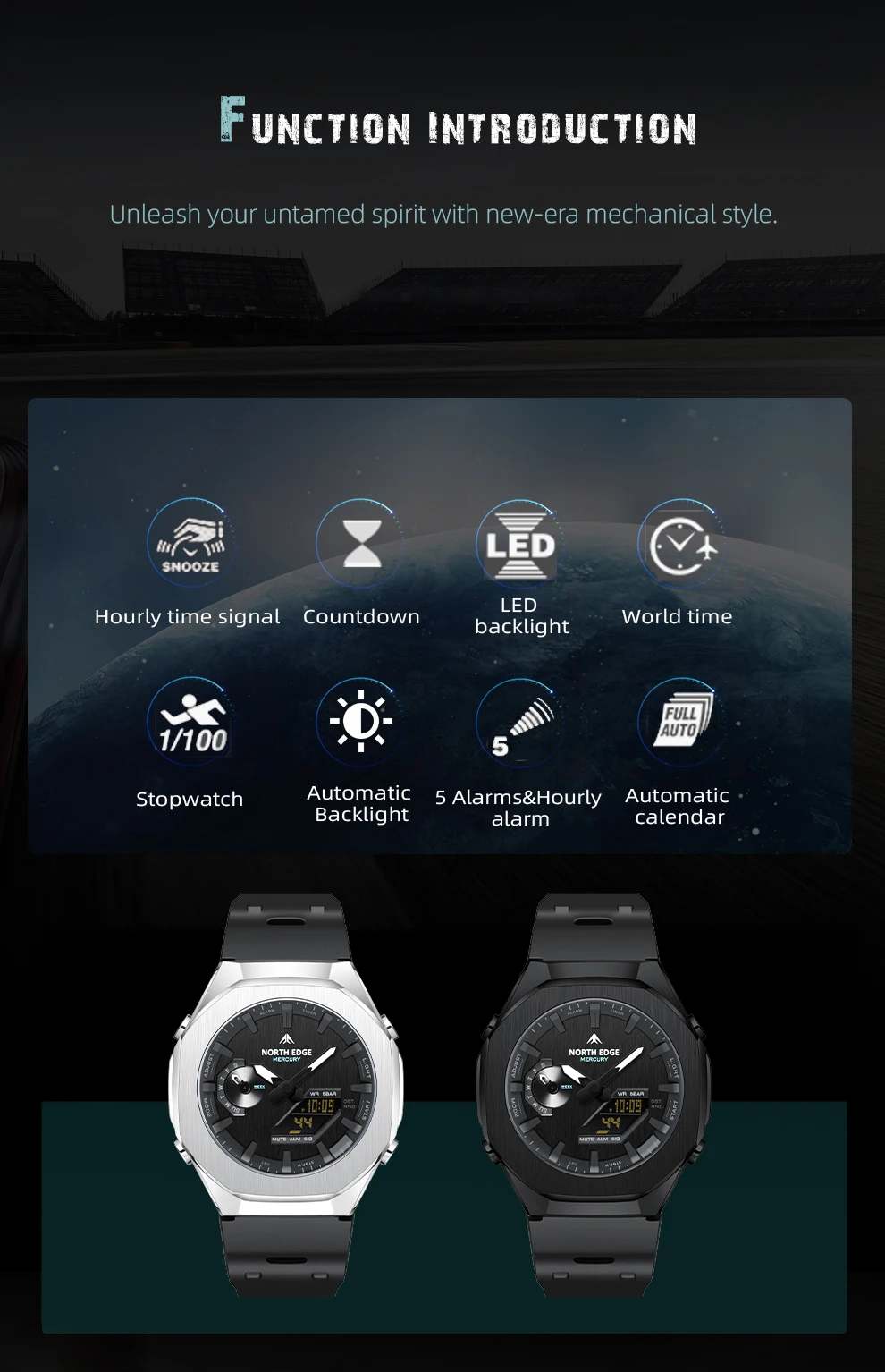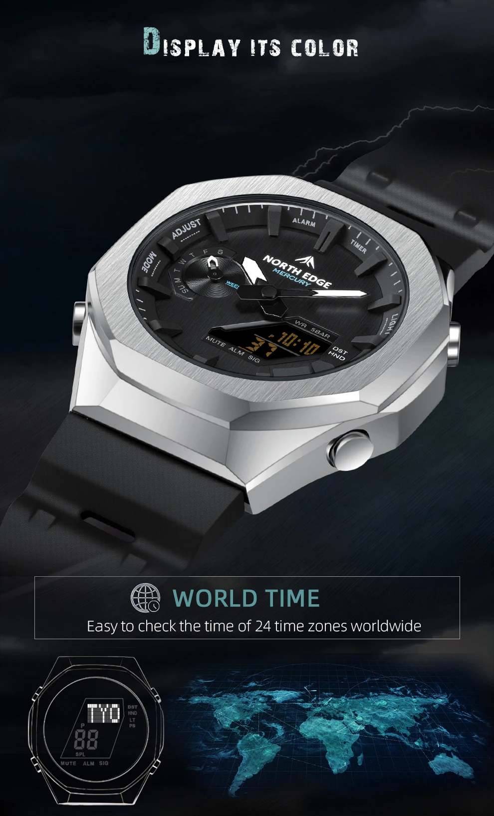 Часы North Edge Mercury Silver — мужские тактические водонепроницаемые электронные часы для спорта и активного отдыха с аналого-цифровым дисплеем, секундомером и несколькими будильниками.