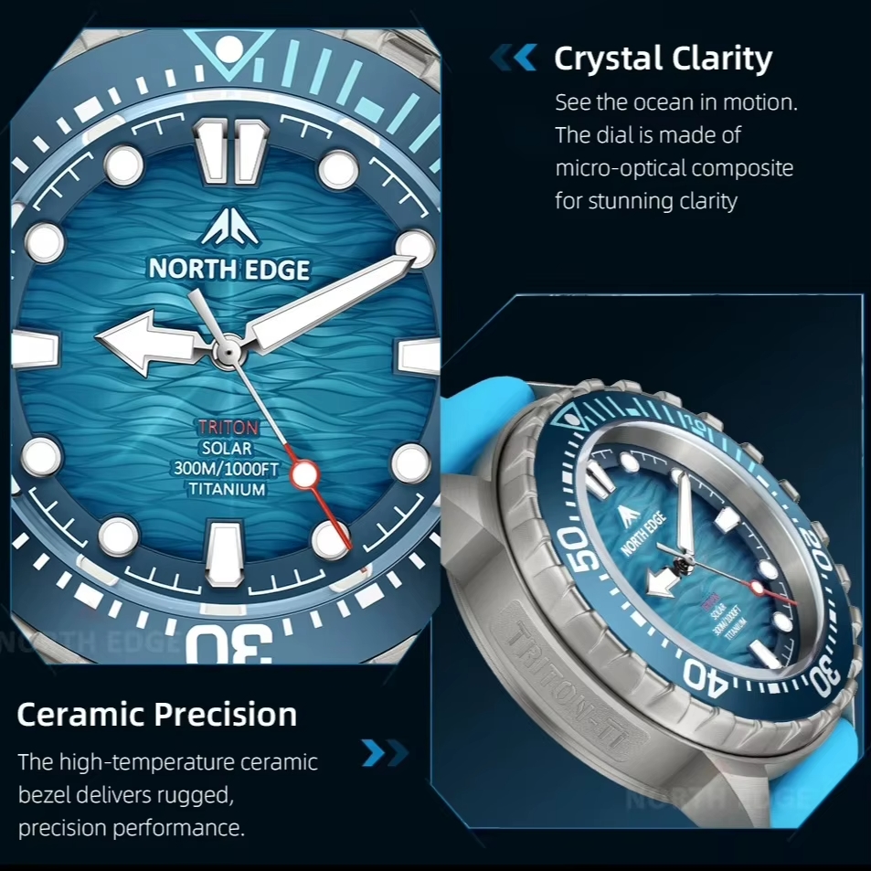 Часы North Edge Triton TI сочетают спортивный дайв-стиль с современным дизайном и титановым корпусом. Они отлично смотрятся как на прогулке и в офисе, так и во время активного отдыха у воды, подчеркивая решительный и уверенный образ.