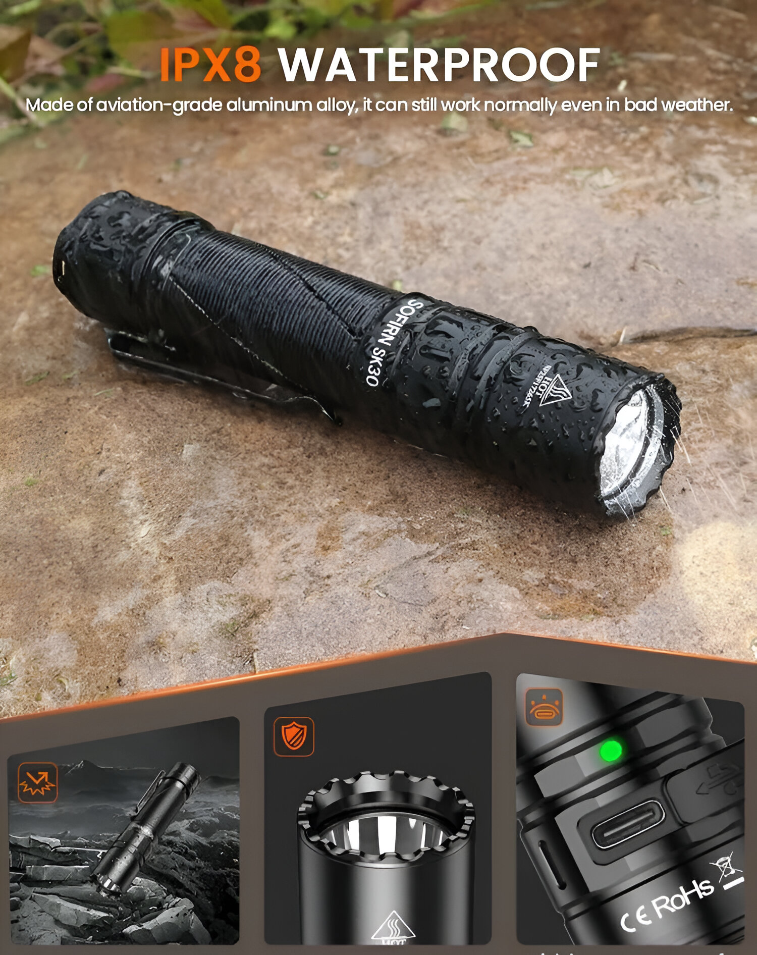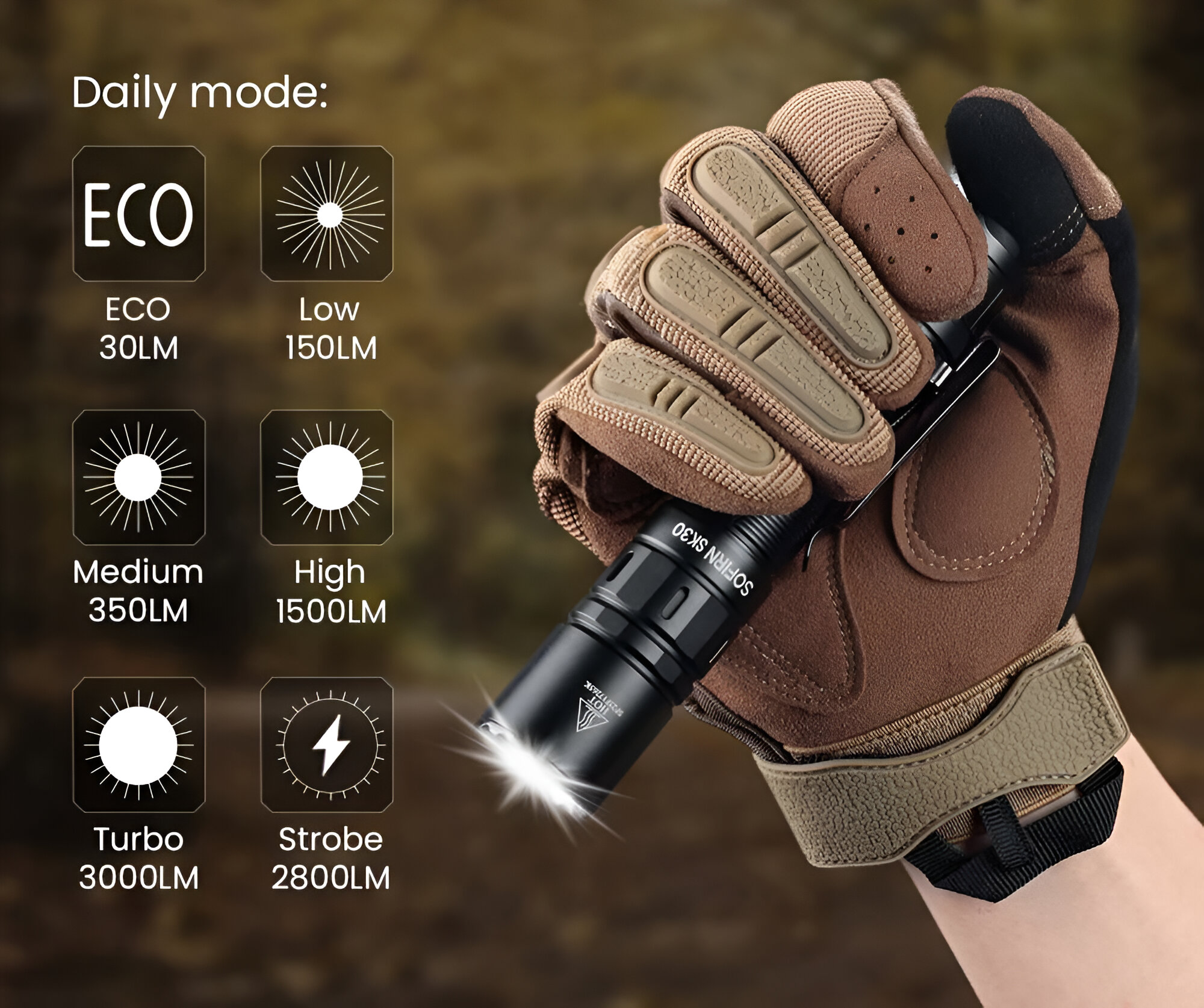 Фонарь Sofirn SK30 — это мощный тактический светодиодный фонарь, предназначенный для профессионального использования и активного отдыха. Его максимальная яркость достигает 3000 люмен, и он обеспечивает дальность освещения до 392 метров. Компактный корпус выполнен из прочного алюминиевого сплава с элементами из нержавеющей стали, что гарантирует высокую износостойкость и долговечность. Фонарь работает на аккумуляторе формата 21700 с встроенной зарядкой через USB Type-C, что удобно для эксплуатации в любых условиях.
