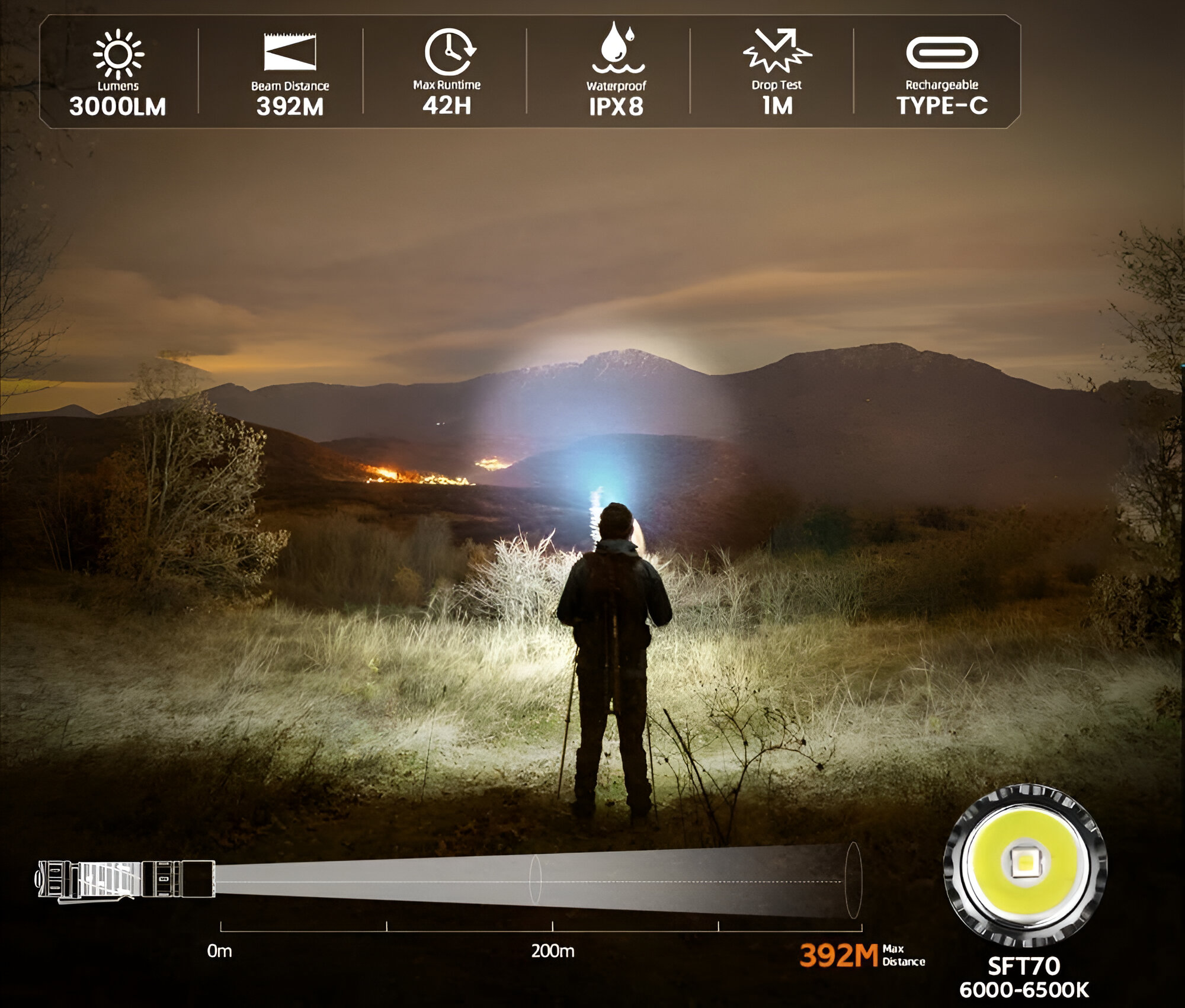 Максимальный световой поток 3000 люмен с дальностью луча до 392 метров