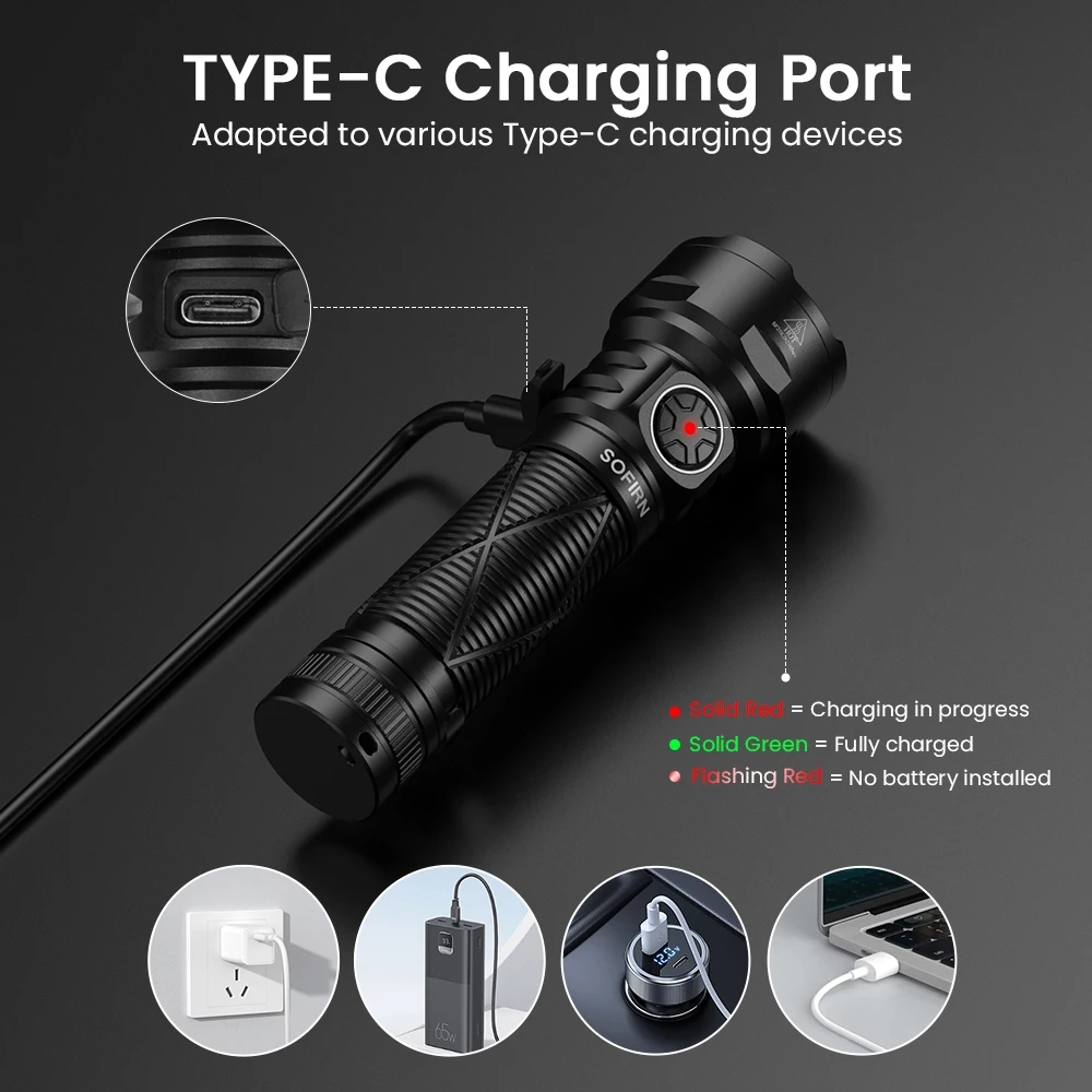 Фонарик Sofirn SR15 UV, аккумулятор 21700 5000 мАч, USB Type-C кабель, клипса, темляк, чехол, упаковка.