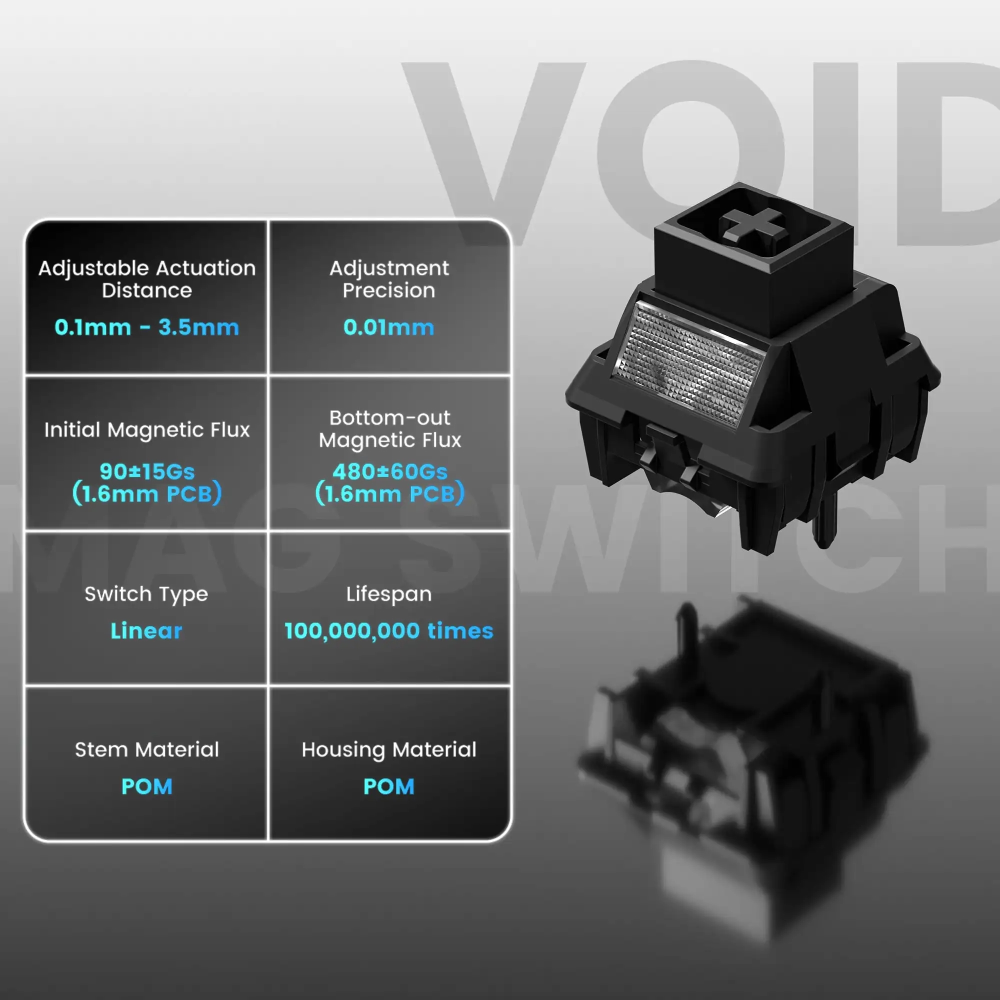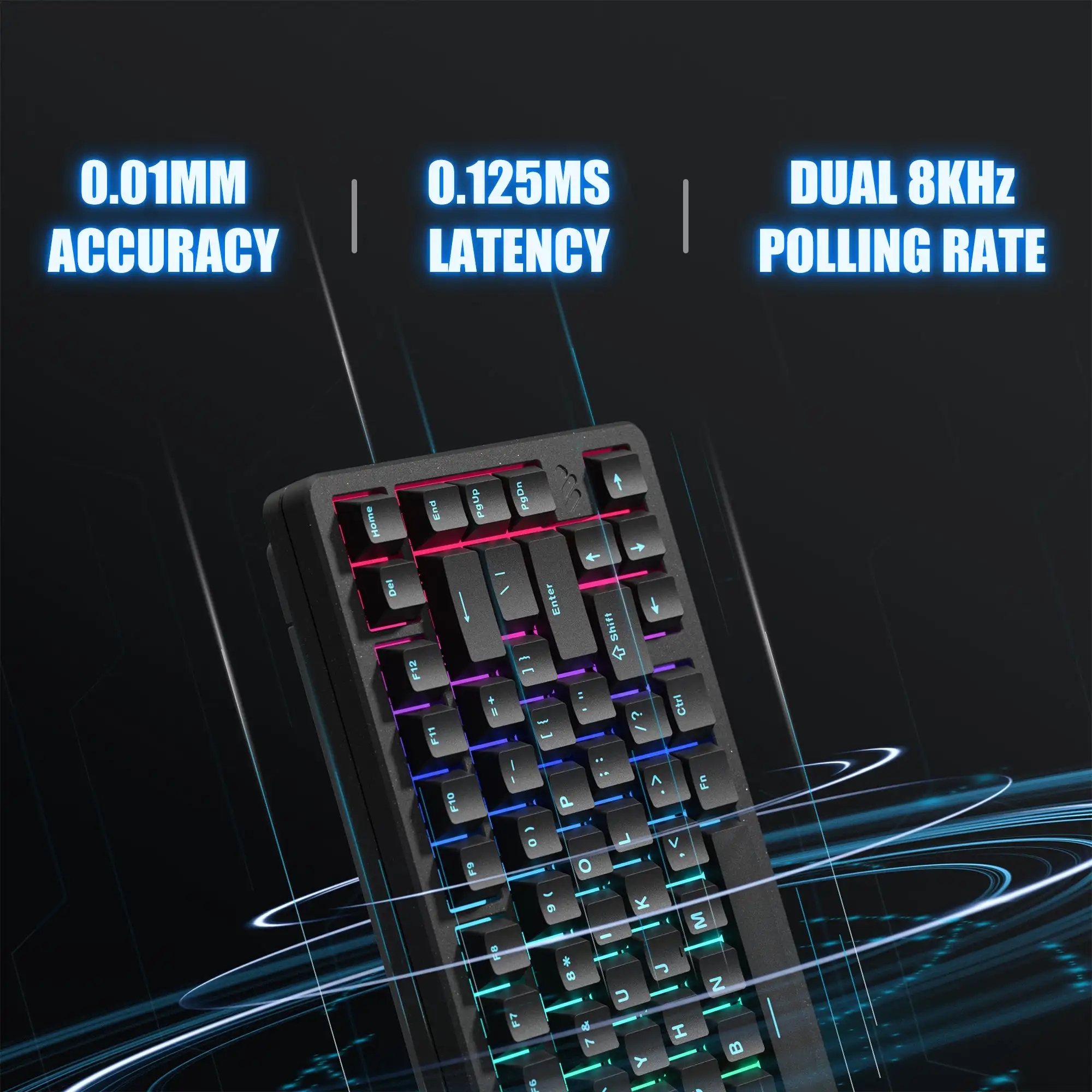Hall Effect магнитные свитчи (Outemu Magnetic / Womier Void) без мертвой зоны, Rapid Trigger для мгновенного повторного срабатывания; NKRO антигостинг исключает пропуски. Полная 8000 Гц в любом режиме, задержка 0.125 мс — быстрее конкурентов.