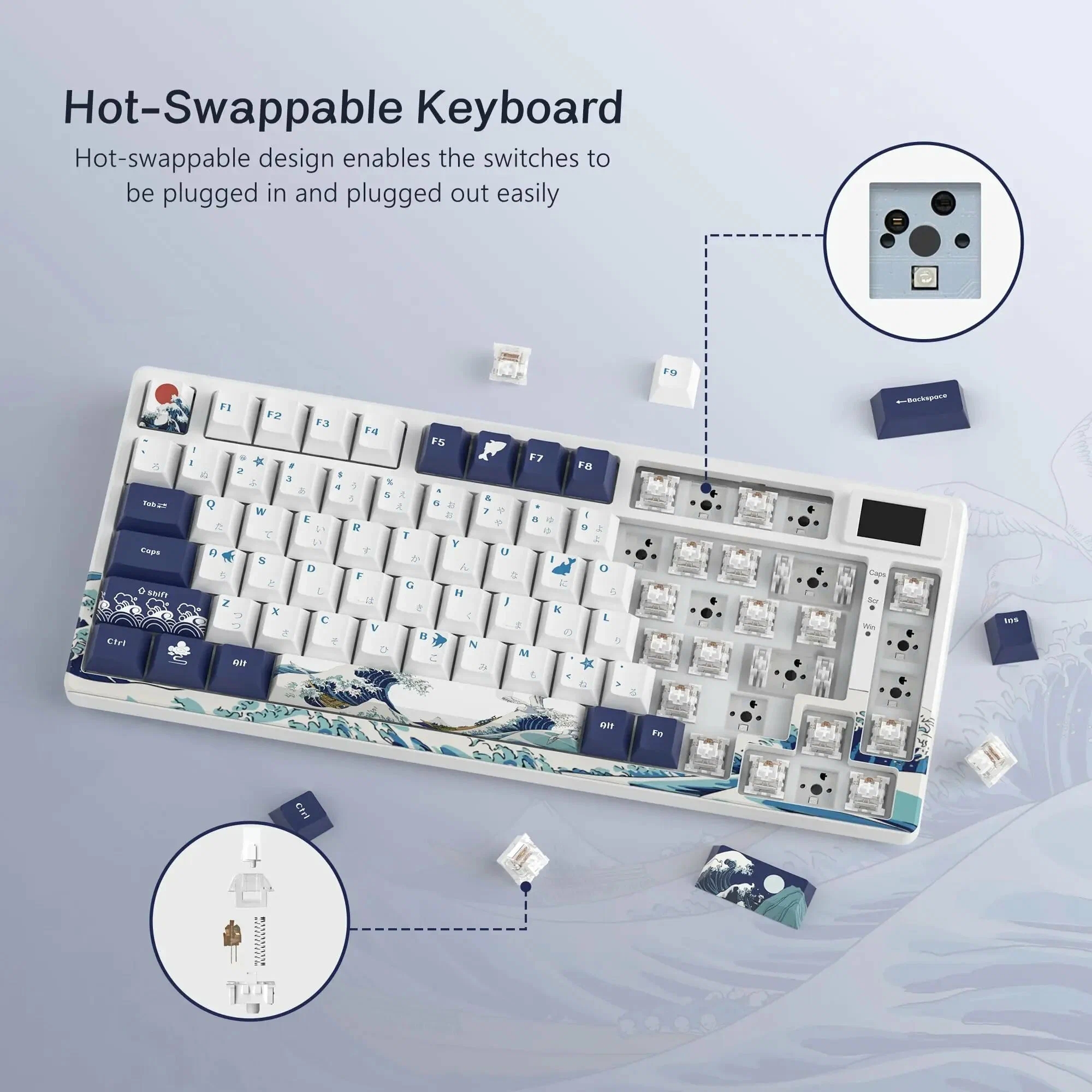 Womier SK80 использует механические свитчи с возможностью горячей замены (поддержка 3 и 5 пиновых переключателей), что позволяет подобрать желаемое ощущение нажатия без пайки. Настраиваемая RGB подсветка предлагает несколько эффектов и уровней яркости, управление режимами возможно с клавиатуры и через программное обеспечение (при наличии).