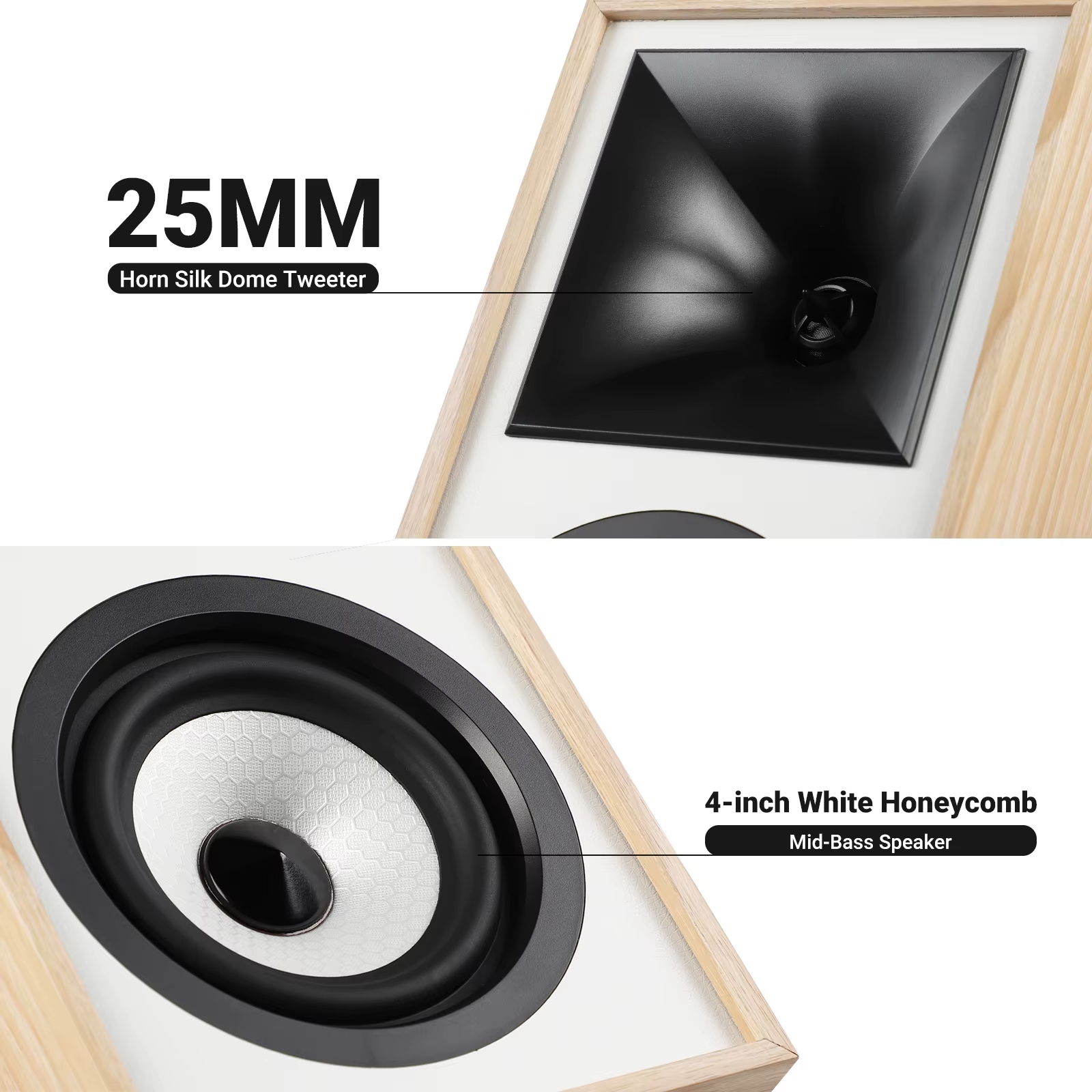 Материал: корпус из MDF/HDF с акустическим демпфированием, матовое покрытие (дерево/пластик) и защитные решётки.