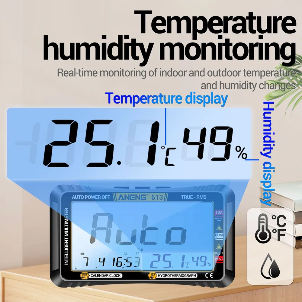 Функция календаря, функция температуры и влажности и функция мультиметра. Вы также можете синхронно проверять дату/время дня во время работы, а вечный календарь не будет закрываться при выключении, что поможет вам лучше управлять своим временем.