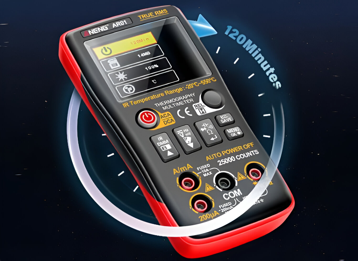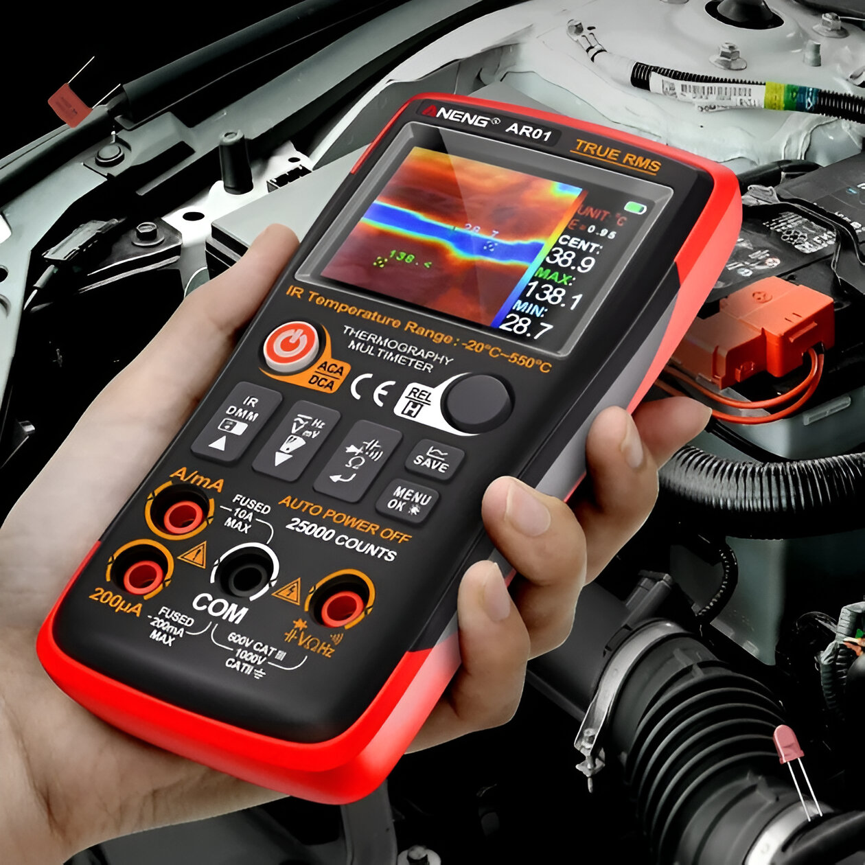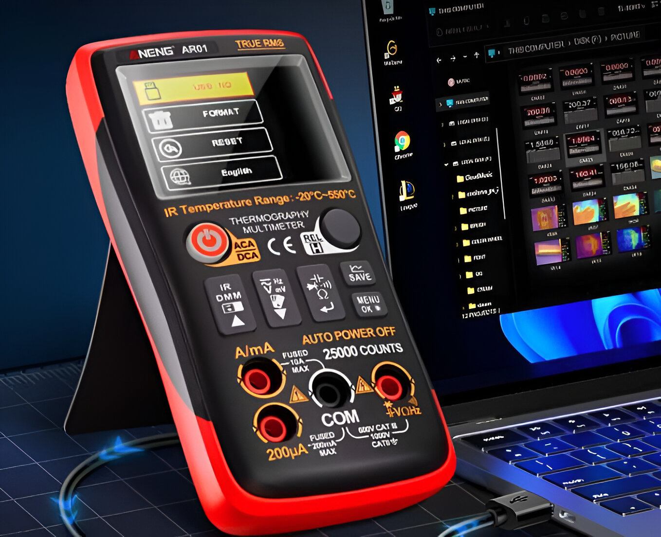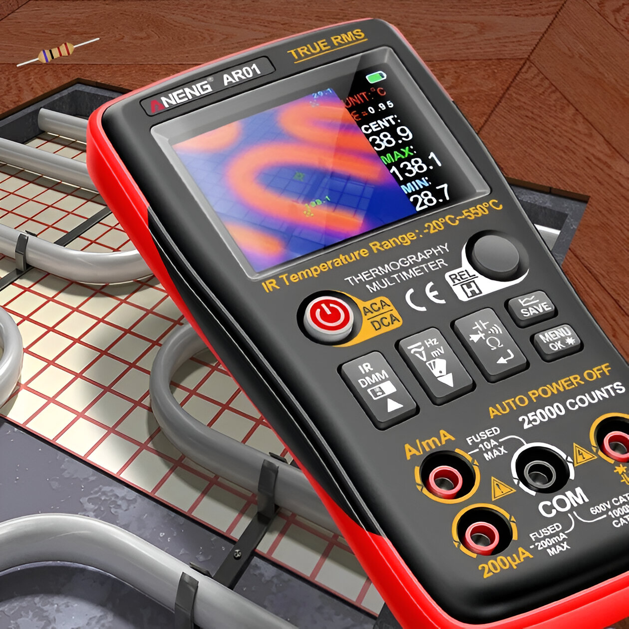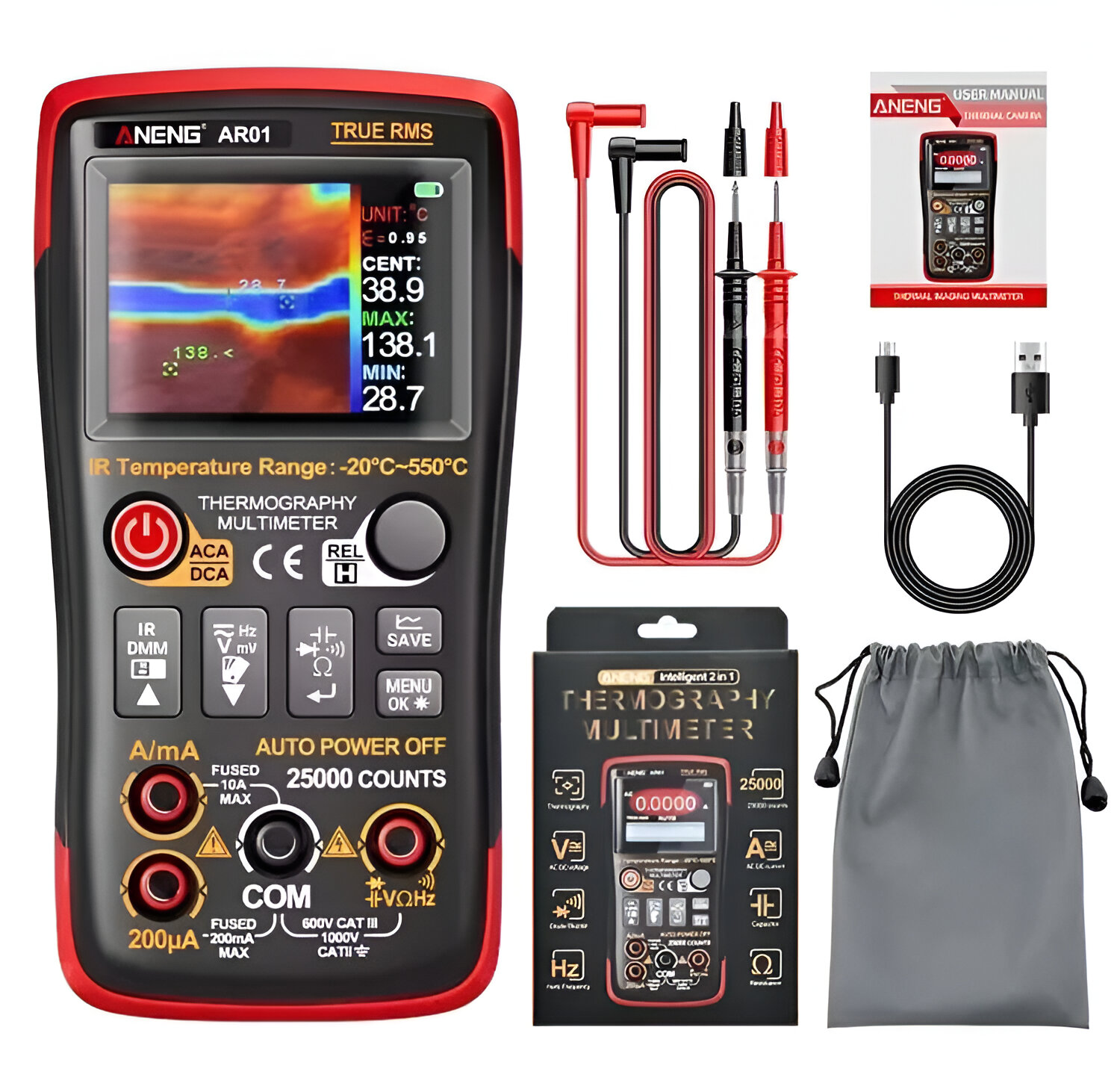 Aneng AR01 — это профессиональный цифровой мультиметр и инфракрасный тепловизор 2 в 1, объединяющий точность измерений и тепловизионный контроль. Высокоточный мультиметр имеет 25000 отсчетов и широкие функции, а встроенный тепловизор с разрешением HD позволяет быстро определить зоны перегрева и проблемы в электросетях.