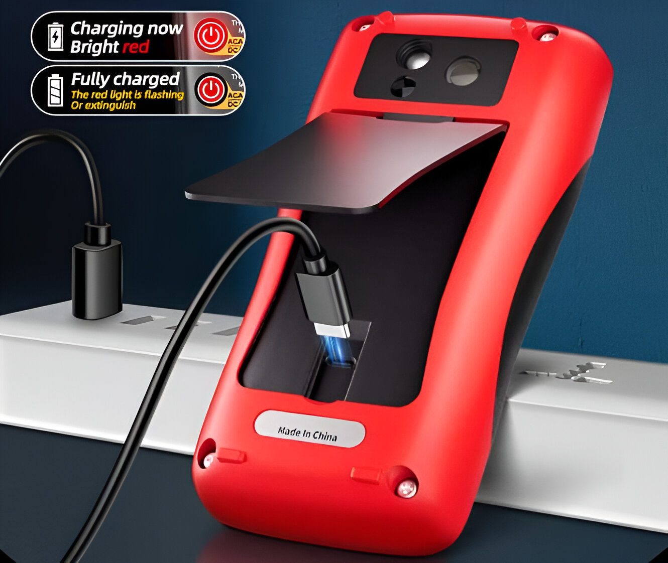Оснащен ярким 2,4-дюймовым TFT-дисплеем 320x240 пикселей, регулируемой подсветкой и встроенным светодиодным фонариком для работы в темных условиях. Питание от встроенного аккумулятора 2000 мАч с функцией автоотключения для экономии энергии. Данные можно хранить, делать скриншоты и передавать на ПК через USB Type-C для анализа.