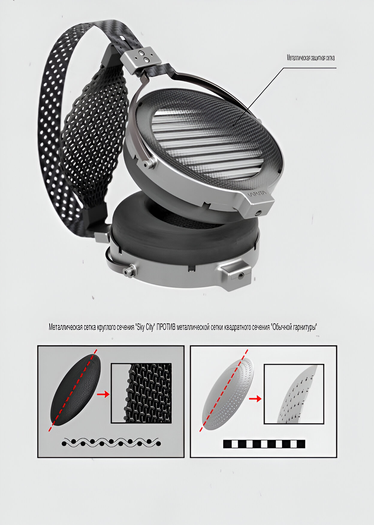 Оголовье изготовлено из сухого углеродного волокна, амбушюры — из гибкого перфорированного материала методом 3D-печати.