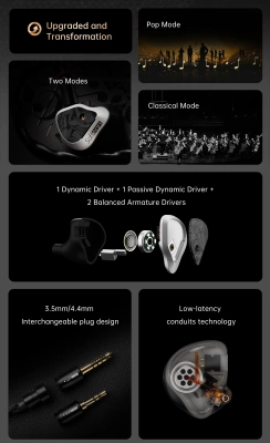 Наушники выполнены в гибридной концепции и используют четыре излучателя – два динамических драйвера и конфигурацию двух арматурных излучателей с каждой стороны. Новинка предлагает два профиля настройки звучания – Classical и Pop, с двумя вариантами импеданса (низкий импеданс и высокий импеданс).