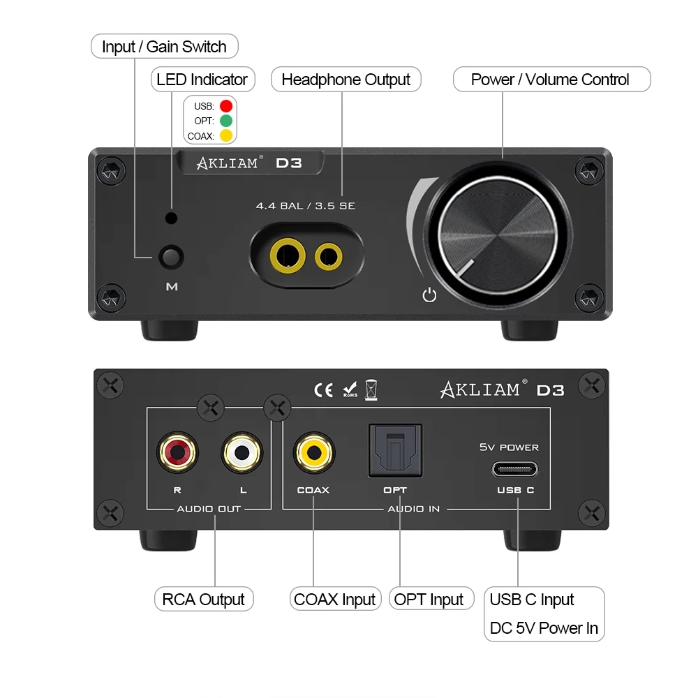 AkLIAM D3 — компактный портативный цифро‑аналоговый преобразователь, который превращает цифровой сигнал в высококачественный аналоговый звук. Подходит для ПК, ноутбуков и смартфонов — улучшает звучание любых наушников и аудиосистем.