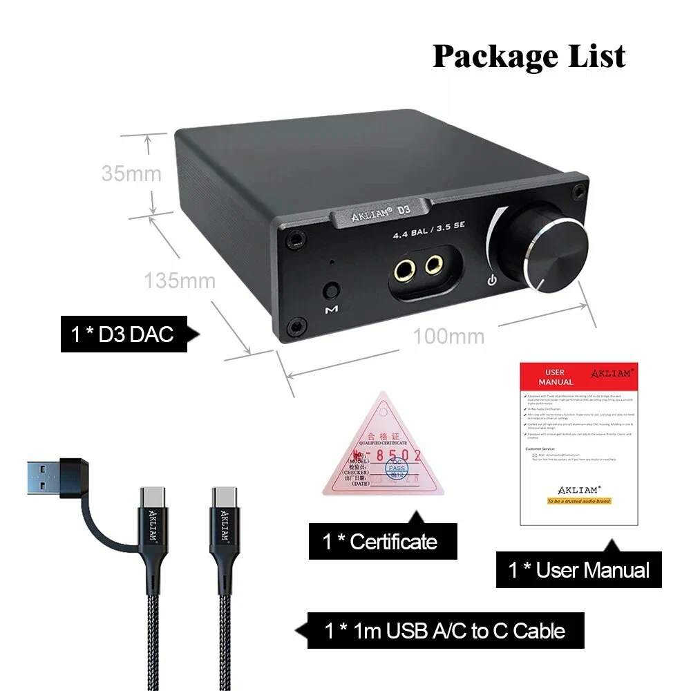 ЦАП AkLIAM D3; USB‑кабель (1 м, в матерчатой оболочке); инструкция.