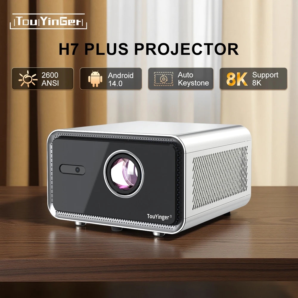 Проектор Touyinger H7 Plus — современный Full HD LED-проектор с автофокусом и автокоррекцией для дома, презентаций и уличного кинотеатра. Native 1080p разрешение, заявленная яркость 2000 ANSI люмен, контраст 20000:1, Android 12, 2ГБ RAM + 32ГБ ROM. WiFi 6 (2.4/5GHz), Bluetooth 5.0, поддержка 4K-декодирования, Miracast/AirPlay.