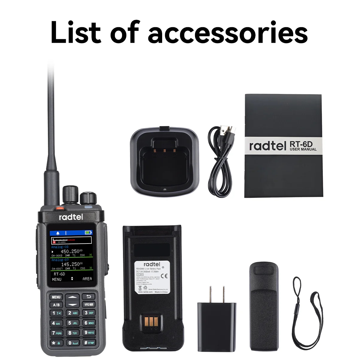 рация RT‑6D PRO; антенна; аккумулятор; зарядное устройство; клипса; ремешок на запястье; инструкция.