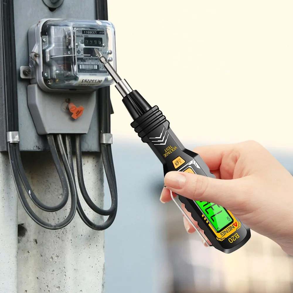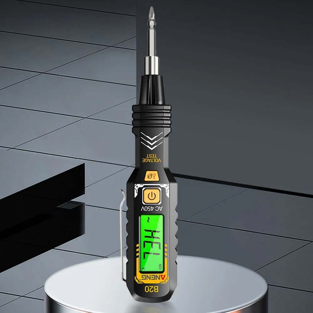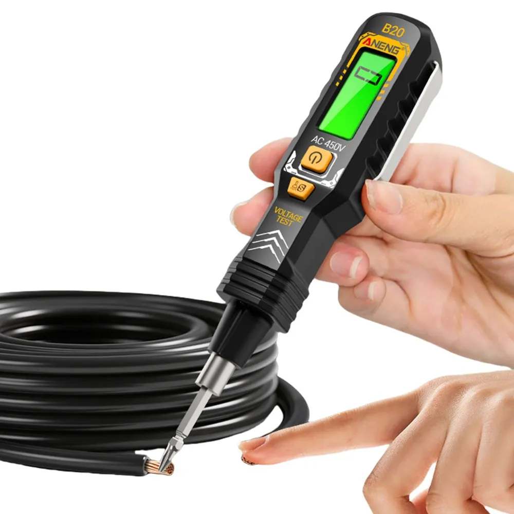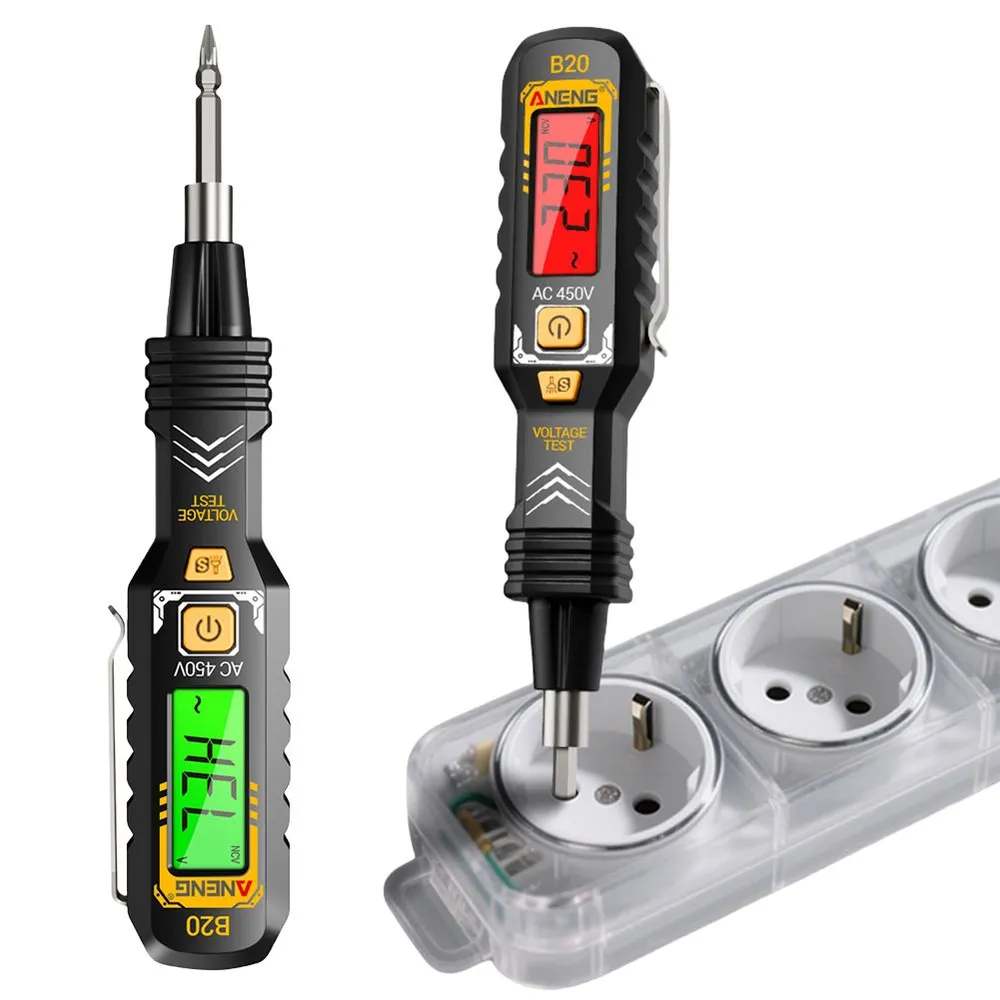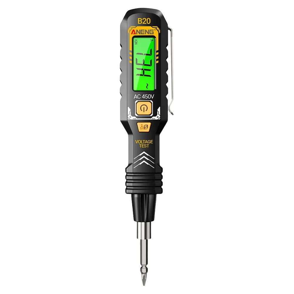 Цифровой тестер напряжения Aneng B20 — это компактное и удобное устройство для быстрого и точного измерения напряжения в диапазоне AC 30-450 В и DC 11-450 В. Он оснащен двуцветным ЖК-дисплеем, который показывает значения в красном (высокое напряжение) и зеленом (низкое напряжение) цветах, что облегчает чтение и диагностику. Встроенный светодиодный фонарь обеспечивает работу в темных условиях, а бесконтактное обнаружение напряжения позволяет безопасно проверять наличие напряжения без контакта с проводом. Также есть контактное измерение, что делает устройство универсальным для бытовых, автомобильных и промышленных задач. Корпус изготовлен из прочного АБС-пластика, легкий — всего 48 г, и оснащен двойной головкой-отверткой для удобства.