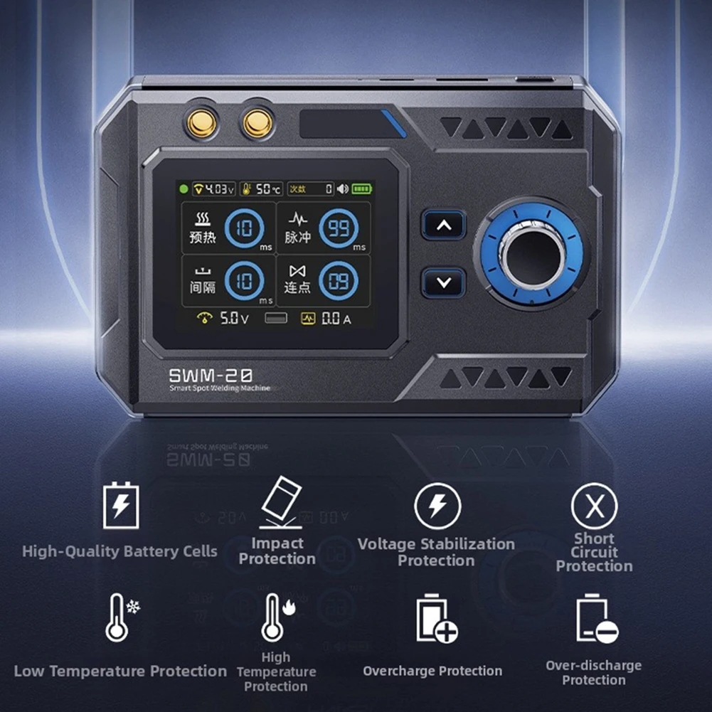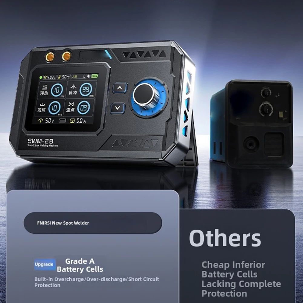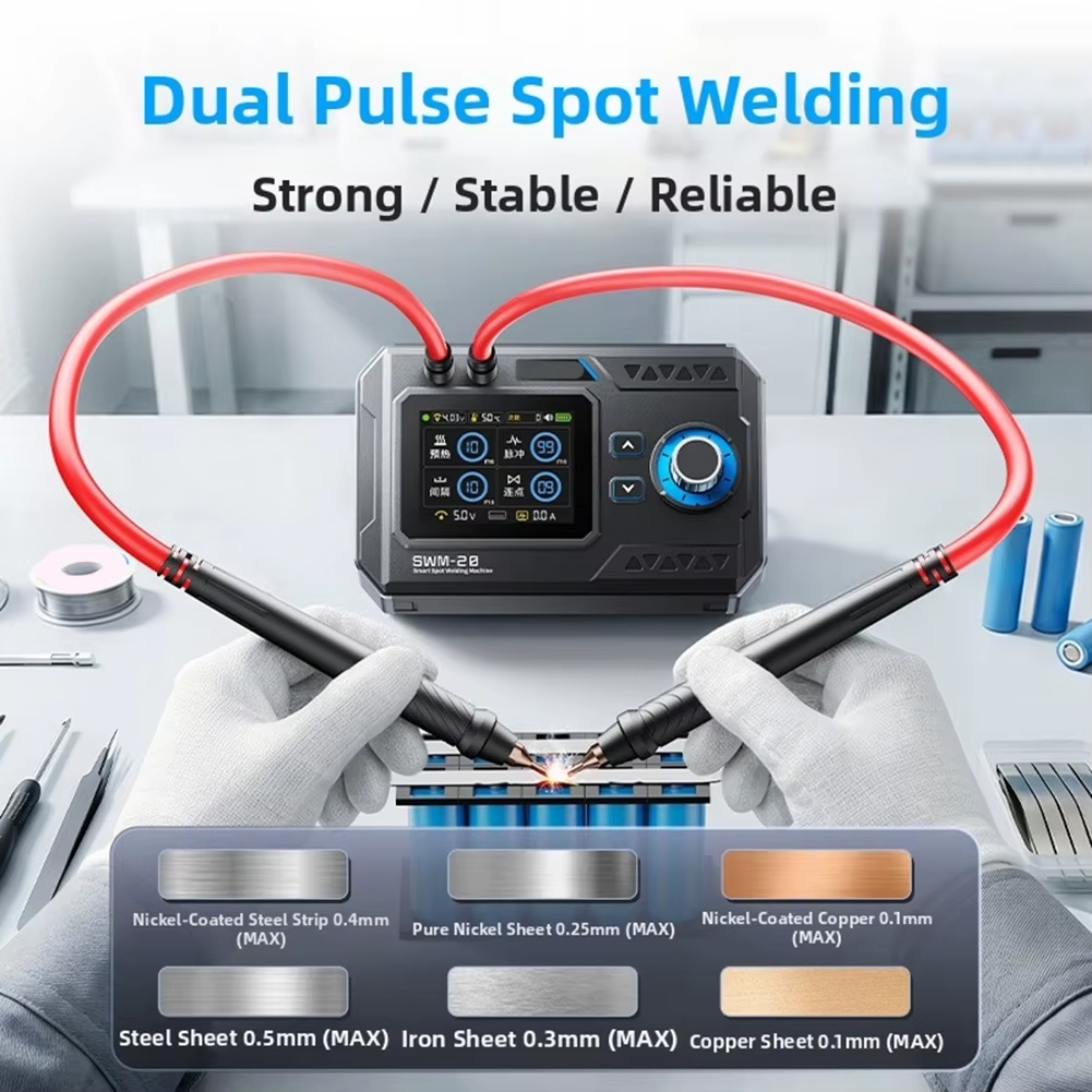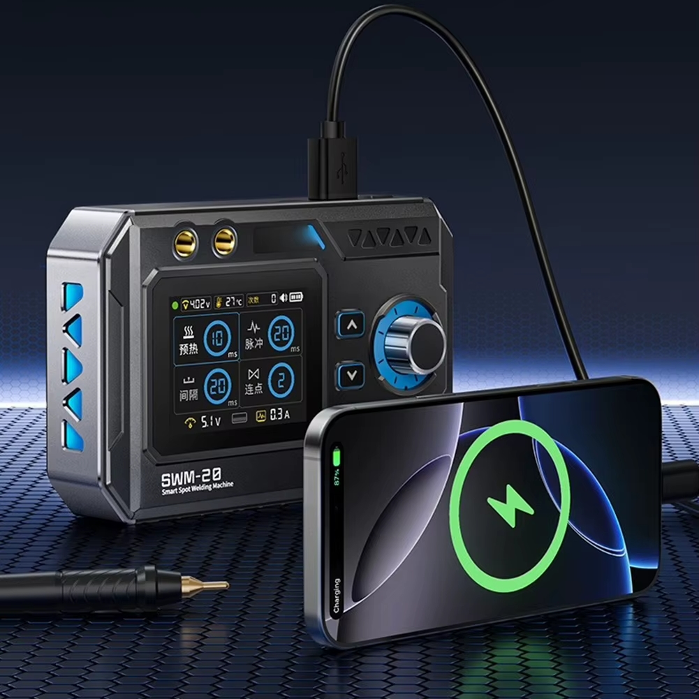 Точечная сварка FNIRSI SWM-20 — профессиональный портативный аккумуляторный аппарат для точечной сварки литиевых батарей 18650, 21700, ремонта электроники и создания DIY power bank. Технология двойного импульса (до 1200 А пикового тока) обеспечивает чистые, прочные швы без искр и прожогов на никелированной стали, чистом никеле (0.1–0.5 мм), меди и алюминии. Компактный дизайн с мощным АКБ 5000 мАч позволяет выполнять до 500–700 циклов сварки на одном заряде, а также использовать устройство как универсальный power bank для смартфонов и гаджетов.