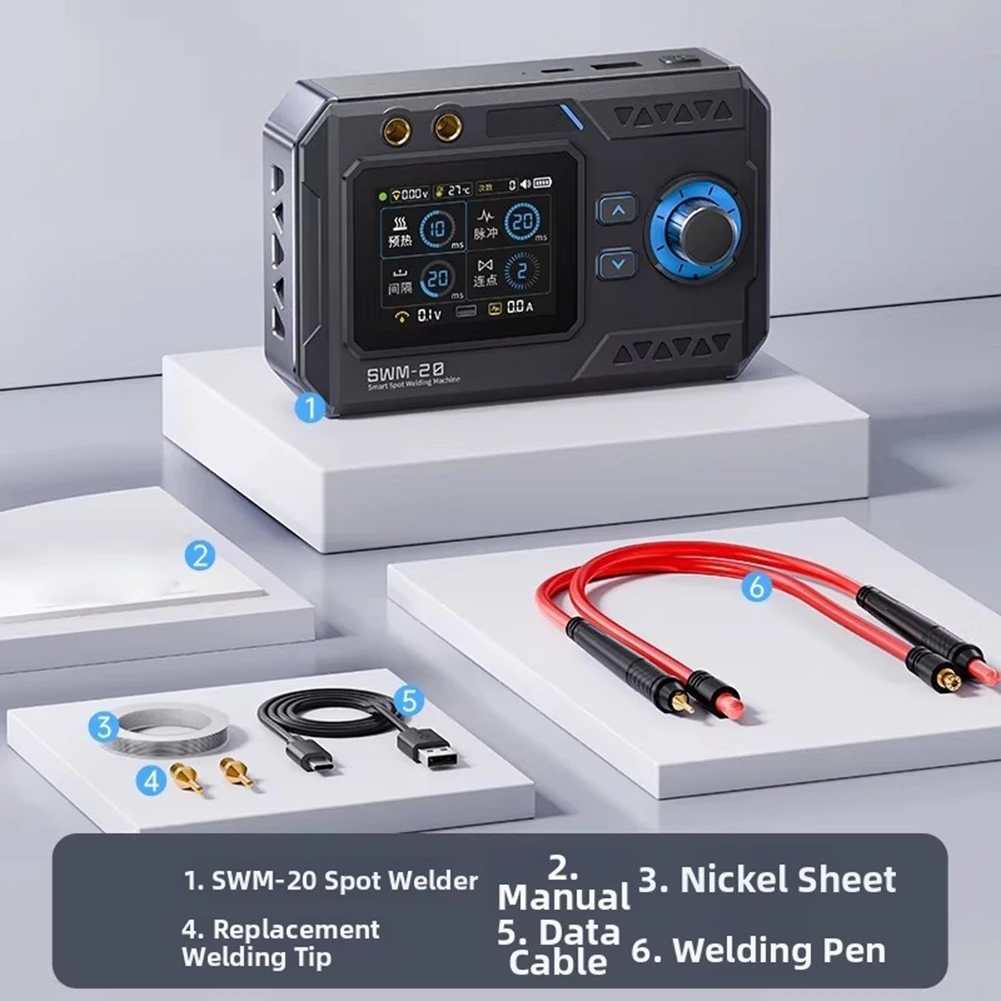 Точечная сварка FNIRSI SWM-20, профессиональные сварочные ручки с медными жилами, USB Type-C кабель, запасные электроды, многоязычная инструкция.