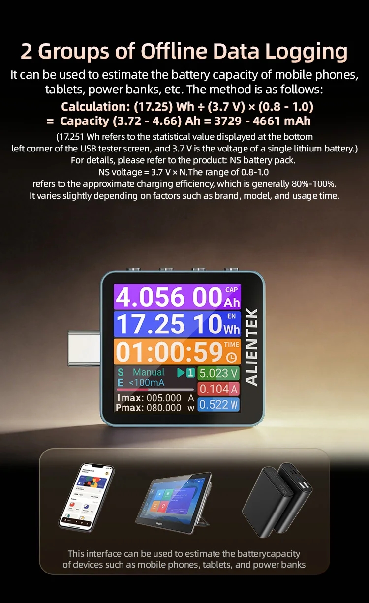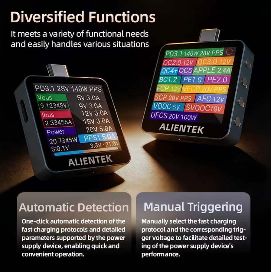 Тестер ALIENTEK C2 Pro поддерживает протоколы быстрой зарядки PD 3.2 и более 15 других стандартов, что позволяет корректно определять режимы питания современных устройств. Устройство отображает мгновенные и средние значения напряжения, тока и мощности, а также интегральную емкость и энергопотребление за время теста, что удобно для проверки реальной емкости пауэрбанков и аккумуляторов.