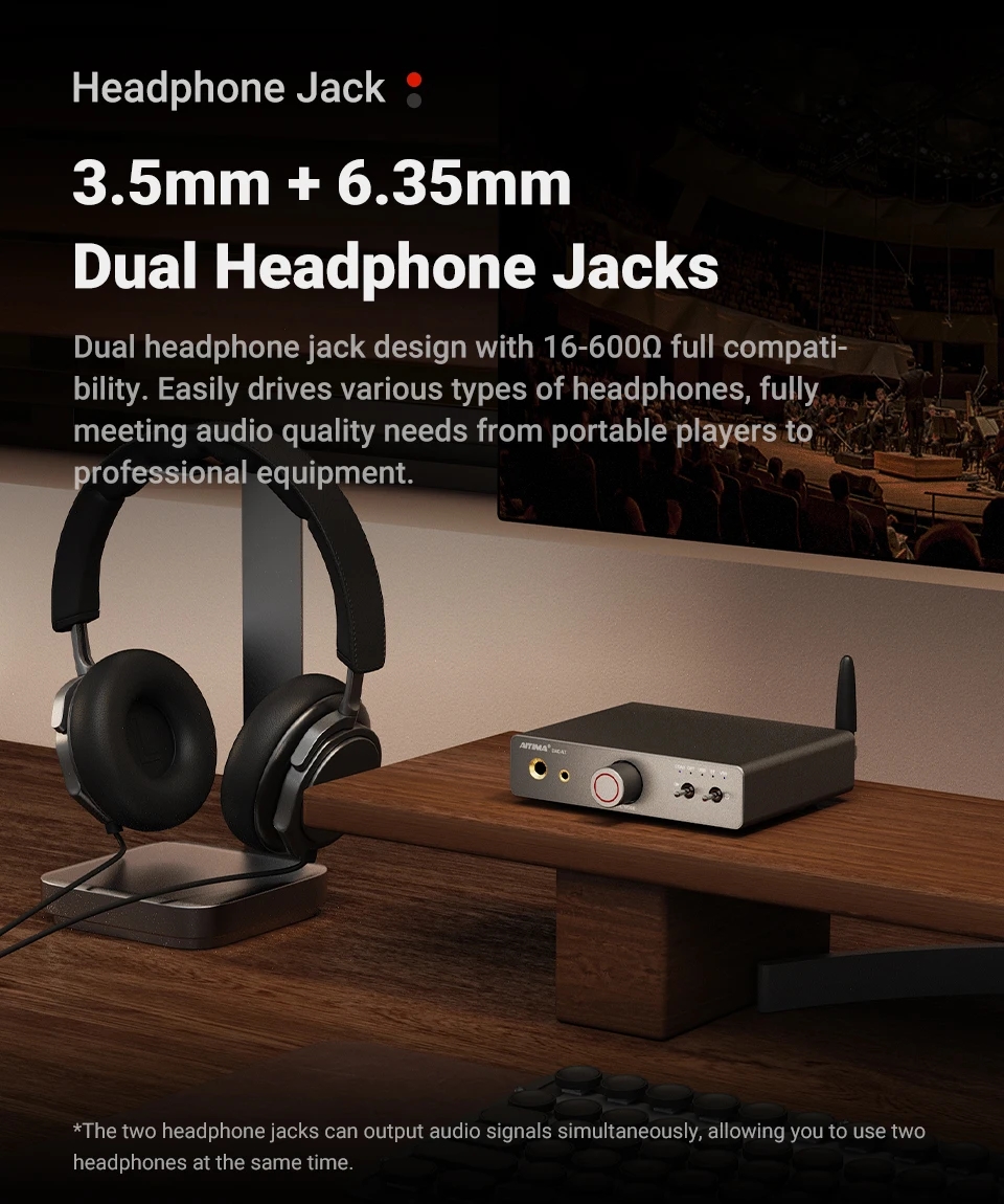 Aiyima DAC‑A7 — компактный настольный ЦАП‑усилитель с Bluetooth, объединяющий функции цифро‑аналогового преобразователя, предусилителя и усилителя для наушников. Идеален для улучшения звука домашней аудиосистемы, ПК или мобильного устройства.